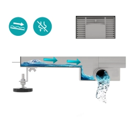 Maskownica o szerokości 7 cm i możliwość wklejenia płytki pozwalają na niemal niewidoczne dopasowanie odpływu do podłogi, co tworzy spójną i estetyczną powierzchnię. Regulowane nóżki znacząco ułatwiają instalację, niezależnie od warunków podłogowych. Z przepustowością do 50 l/min, odpływ gwarantuje szybkie i efektywne usuwanie wody z powierzchni prysznica.