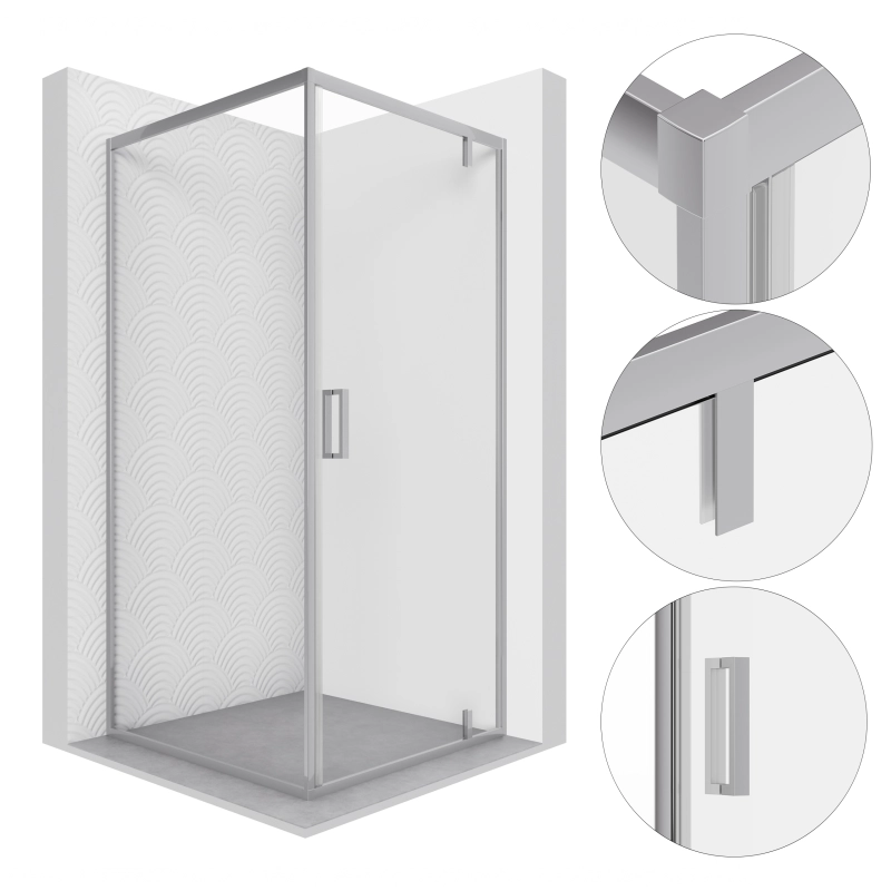 Model oferuje regulację wymiarów (zakres 118,5–120 cm × 88,5–90 cm), montaż narożny (na brodziku lub bezpośrednio na płytkach), drzwi uchylne z zakresem ruchu 180° oraz powłokę Easy2Clean, która ułatwia utrzymanie powierzchni w czystości i poprawia komfort użytkowania.