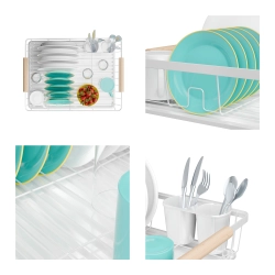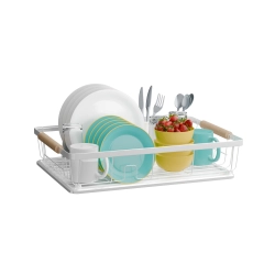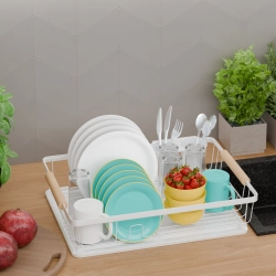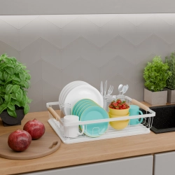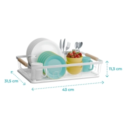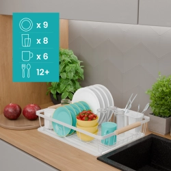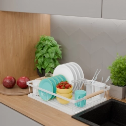 Kompaktowa suszarka SEVANTE z drewnianymi uchwytami to połączenie funkcjonalności z ciepłym, naturalnym designem. Solidna konstrukcja ze stali nierdzewnej gwarantuje trwałość, a stylowe drewniane uchwyty dodają elegancji i ułatwiają przenoszenie. Pomimo niewielkich rozmiarów, suszarka pomieści naczynia całej rodziny – talerze, szklanki, kubki i komplet sztućców. Plastikowa tacka ociekowa chroni blat przed wodą. To idealne rozwiązanie dla osób ceniących estetykę i praktyczność.
