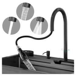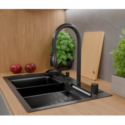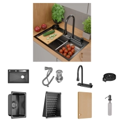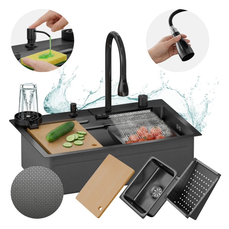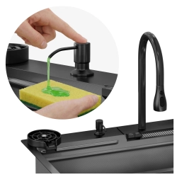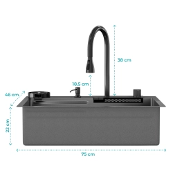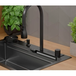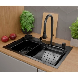 Model ZK04 został zaprojektowany z myślą o maksymalnej funkcjonalności i wygodzie użytkowania. Jednokomorowa konstrukcja zapewnia dużą przestrzeń roboczą, a zintegrowane akcesoria znacząco ułatwiają codzienne czynności kuchenne – od mycia naczyń, przez przygotowywanie posiłków, aż po utrzymanie porządku. Czarna, matowa powierzchnia nadaje całości elegancki charakter, a jednocześnie jest łatwa w utrzymaniu czystości.