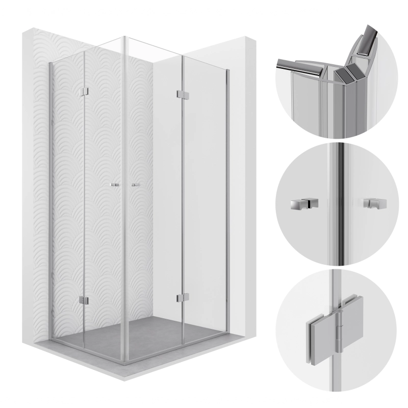 Składane drzwi z zakresem ruchomości 180° zapewniają wygodny dostęp do wnętrza kabiny, co jest szczególnie ważne w większych przestrzeniach łazienkowych. Uniwersalny montaż umożliwia instalację na brodziku lub bezpośrednio na płytkach, dając pełną elastyczność aranżacyjną. System regulacji wymiarów oraz niwelacja nierówności ścian sprawiają, że montaż jest szybki i precyzyjny. To doskonały wybór dla osób szukających połączenia funkcjonalności z eleganckim designem.