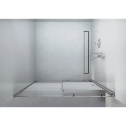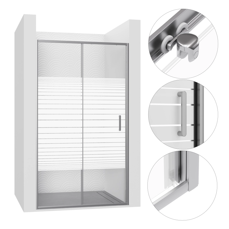 Chromowana rama z eleganckimi białymi pasami nadaje całości ekskluzywnego charakteru. Szerokość montażowa 94-96 cm oraz wysokość 190 cm zapewniają optymalną przestrzeń kąpielową, a zakres regulacji +/- 1 cm pozwala na precyzyjne dopasowanie do ścian. Uniwersalny montaż umożliwia instalację zarówno na brodziku, jak i bezpośrednio na podłodze. Transparentne szkło optycznie powiększa łazienkę, a aluminiowy profil gwarantuje stabilność i trwałość konstrukcji.
