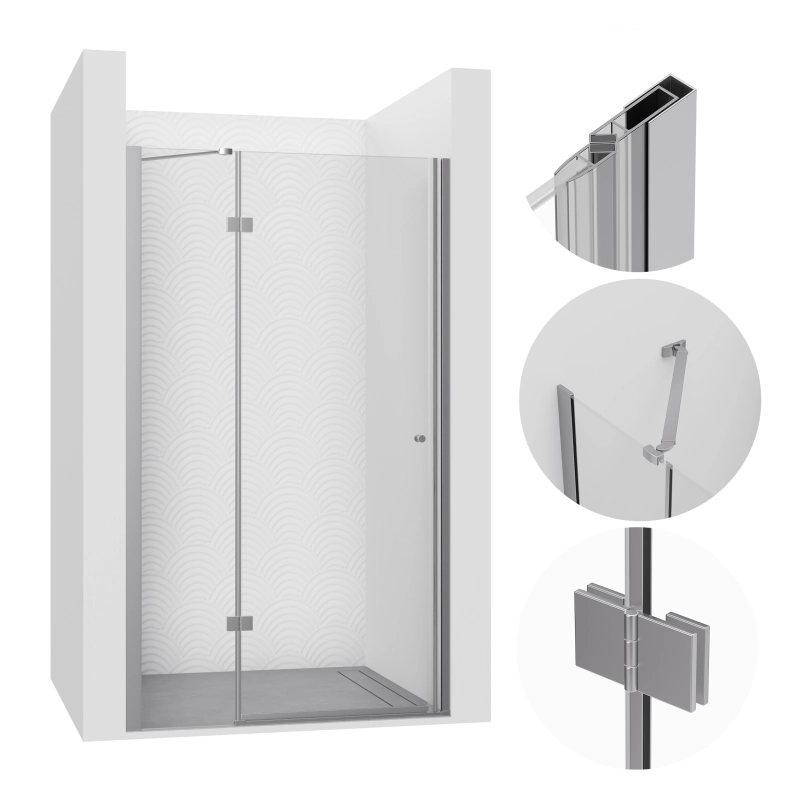Imponująca szerokość montażowa 118-121 cm z dodatkową regulacją 1,5 cm w profilu zapewnia idealne dopasowanie do wnęki. System uchylny z ergonomicznym uchwytem gwarantuje wygodne korzystanie z kabiny. Transparentne szkło i wysokość 190 cm tworzą przestronną przestrzeń kąpielową. Uniwersalny montaż i system niwelacji nierówności ściany umożliwiają perfekcyjną instalację.