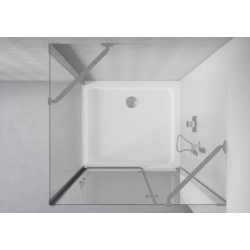 Drzwi przesuwne działają płynnie dzięki solidnym dolnym rolkom. Wysokość 190 cm gwarantuje wygodę użytkowania. Montaż możliwy narożnie – na brodziku lub bezpośrednio na płytkach, a aluminiowy profil z niwelacją nierówności ściany zapewnia stabilność i szczelność.