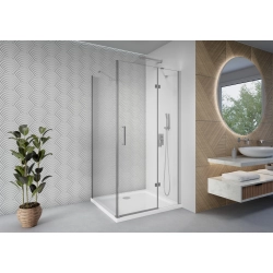 Drzwi uchylne otwierają się w zakresie 180°. Wysokość 190 cm to wygoda użytkowania. Montaż narożny – z brodzikiem lub bez – z profilem kompensacyjnym i kompletnym zestawem montażowym.