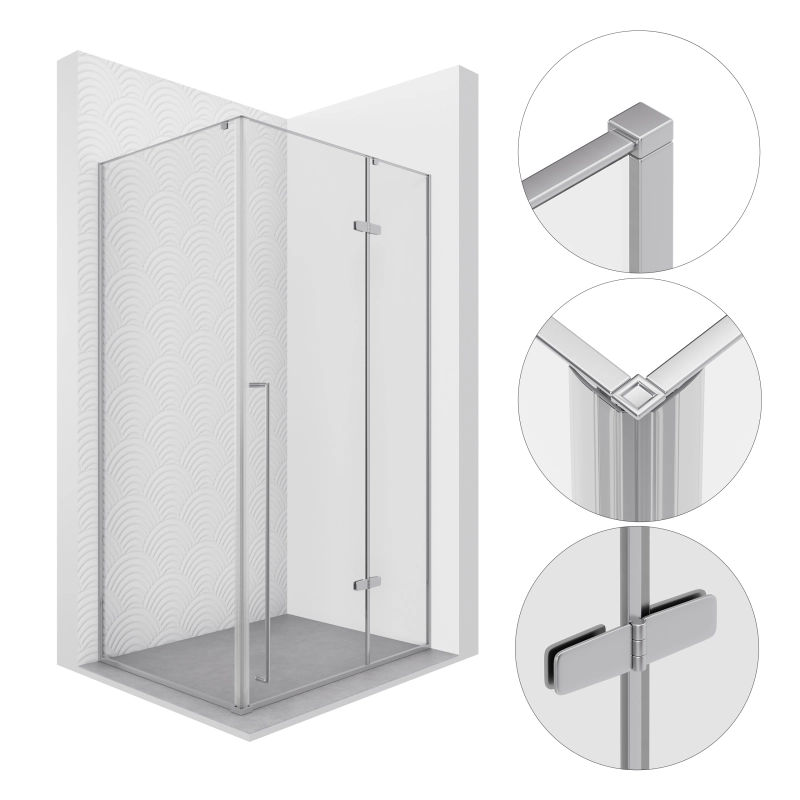 Model oferuje regulację wymiarów (zakres 88,5–89,5 cm × 78,5–79,5 cm), montaż narożny (na brodziku lub bezpośrednio na płytkach), drzwi uchylne oraz powłokę Easy2Clean, która ułatwia utrzymanie powierzchni w czystości i poprawia komfort użytkowania.