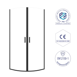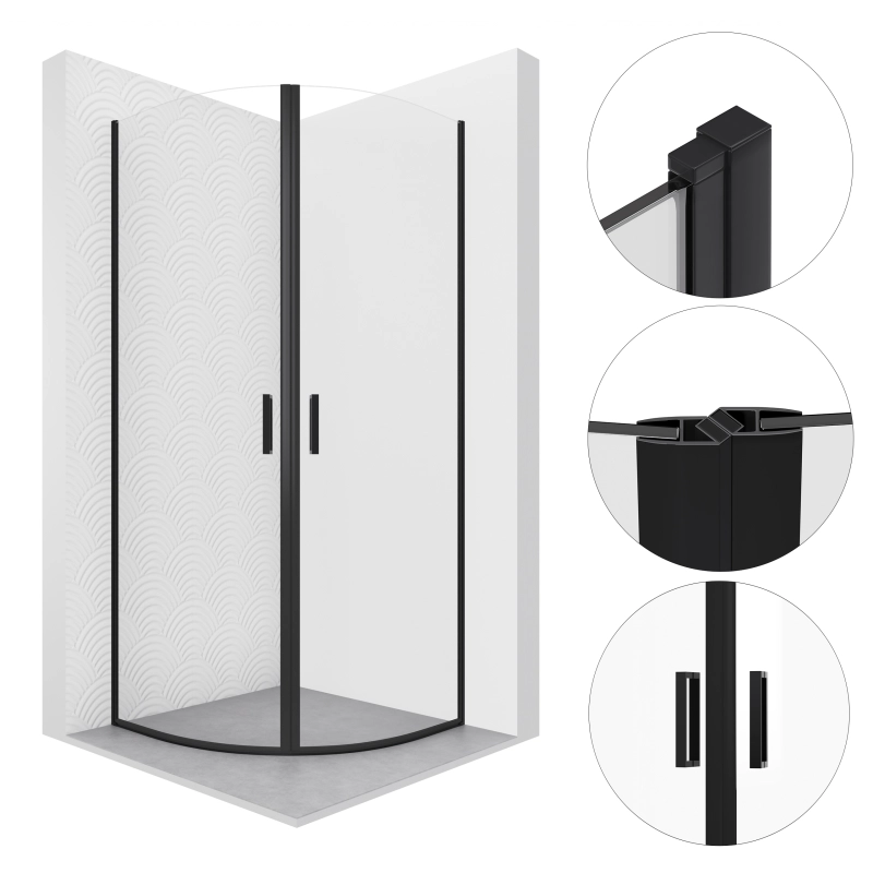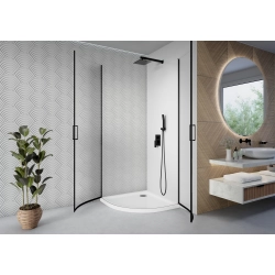 Kabina prysznicowa półokrągła 90×90 cm KB110 CEFALU SEVANTE to stylowe rozwiązanie do łazienek, w których liczy się zarówno design, jak i funkcjonalność. Szkło hartowane o grubości 6 mm zestawiono z czarnymi profilami, co nadaje konstrukcji elegancki i spójny charakter.