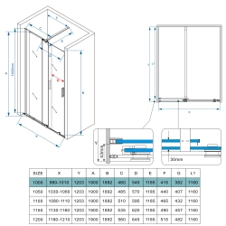 Model oferuje zakres montażowy szerokości około 98–100 cm i wysokości 190 cm, co umożliwia instalację zarówno na brodziku, jak i bezpośrednio na płytkach. Drzwi uchylne i powłoka Easy2Clean znacznie ułatwiają codzienne użytkowanie i czyszczenie powierzchni.