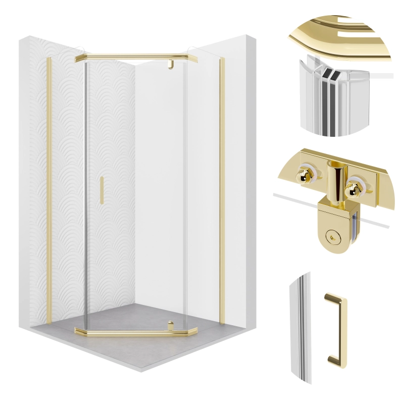 Kabina prysznicowa pięciokątna 80×80 cm KB227 NEPER od SEVANTE to idealne połączenie nowoczesnego stylu i funkcjonalności w eleganckim wydaniu. Przezroczyste, hartowane szkło o grubości 6 mm z powłoką NANO Easy2Clean gwarantuje bezpieczeństwo użytkowania i znacznie ułatwia utrzymanie czystości. Aluminiowe profile w złotym wykończeniu nadają kabinie stylowy charakter i subtelną elegancję, dzięki czemu wnętrze łazienki zyskuje nowoczesny, luksusowy akcent.