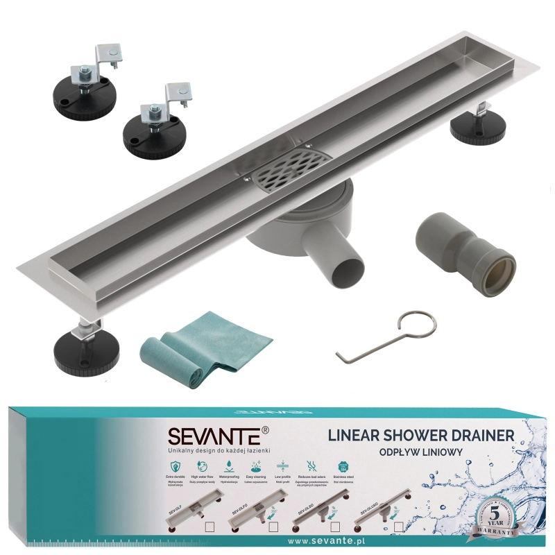 Korpus odpływu liniowego OL029 FLAT SEVANTE to praktyczne odwodnienie prysznicowe, które łączy estetykę z doskonałą funkcjonalnością. Dzięki obrotowemu syfonowi możliwe jest precyzyjne dopasowanie odpływu do istniejącej instalacji kanalizacyjnej, co znacznie ułatwia montaż. Regulowane nóżki gwarantują stabilne i równe ustawienie, a szerokość rynny 7 cm tworzy minimalistyczny efekt, zachowując jednocześnie wysoką wydajność odprowadzania wody - do 50 l/min.